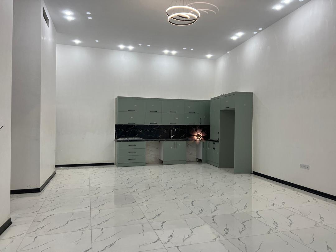 - آشپزخانه: کابینتهای سبز تیره با صفحه و دیوارپوش سنگ مشکی مرمری، نورپردازی سقفی و لوستر مدرن