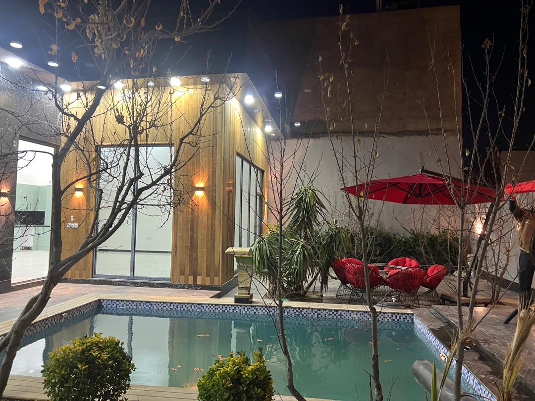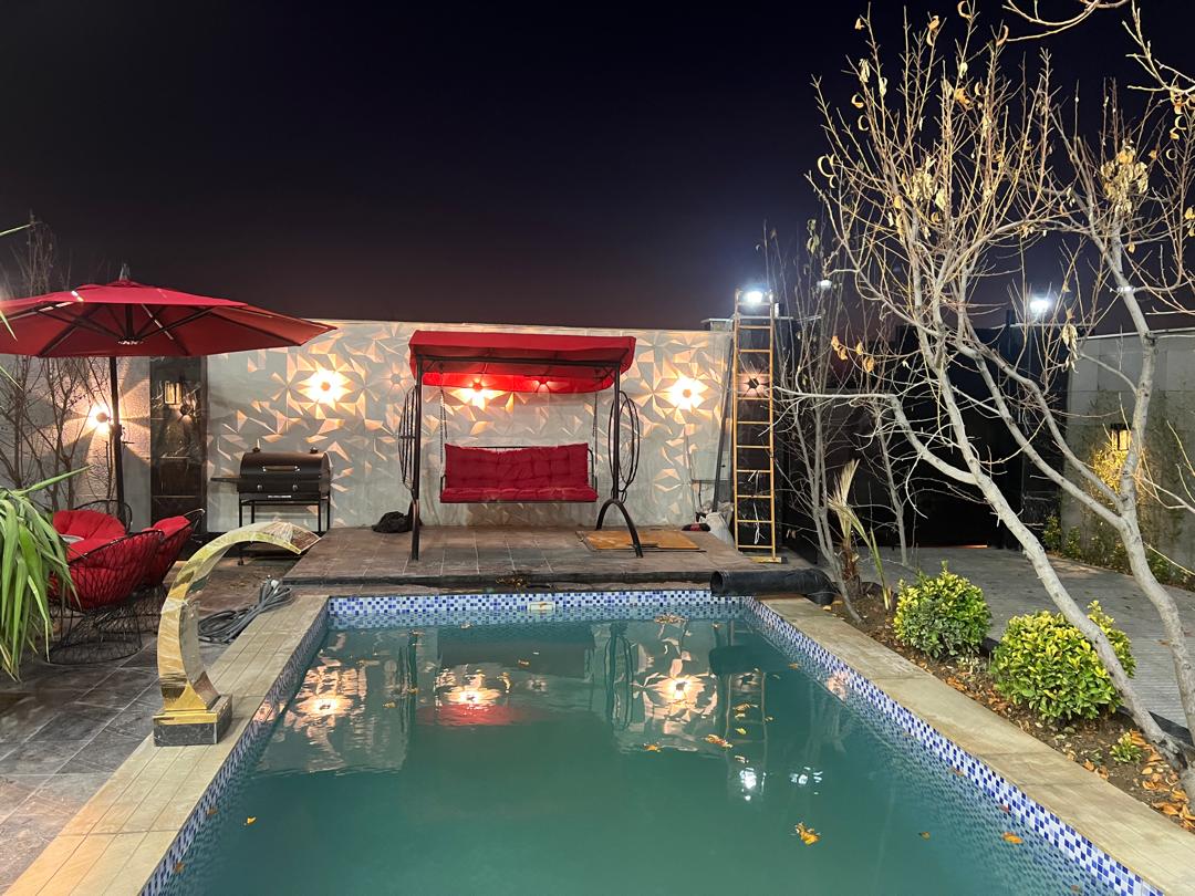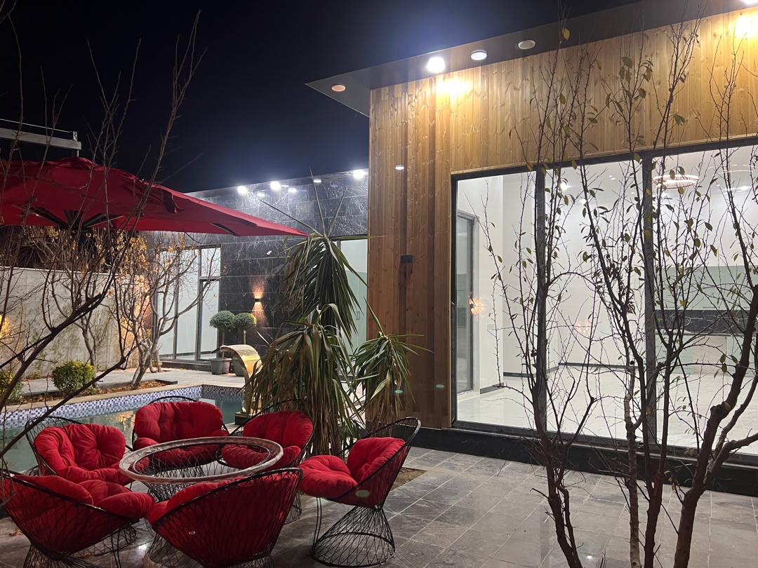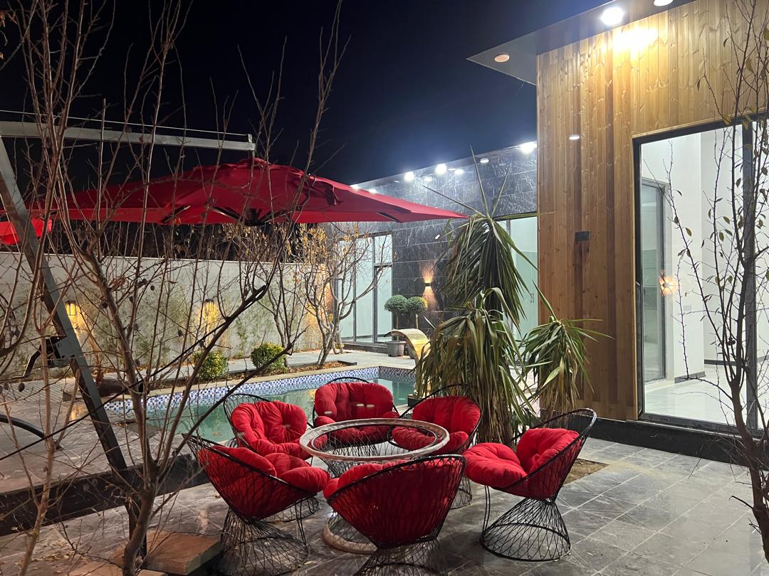 - آلاچیق و فضای نشیمن: مجهز به صندلیهای مدرن با کوسنهای قرمز، سایهبانهای بزرگ و میز مرکزی برای دورهمیهای شبانه
