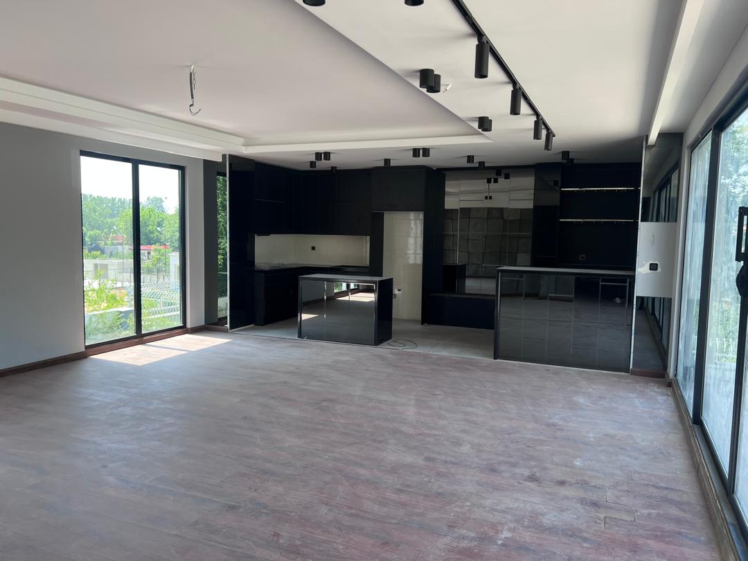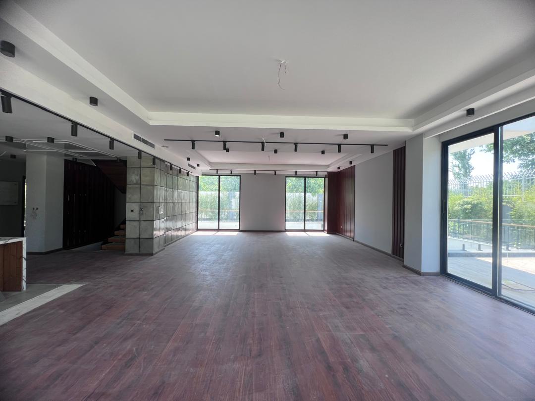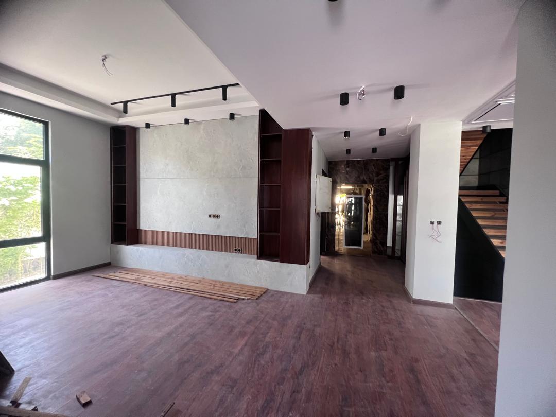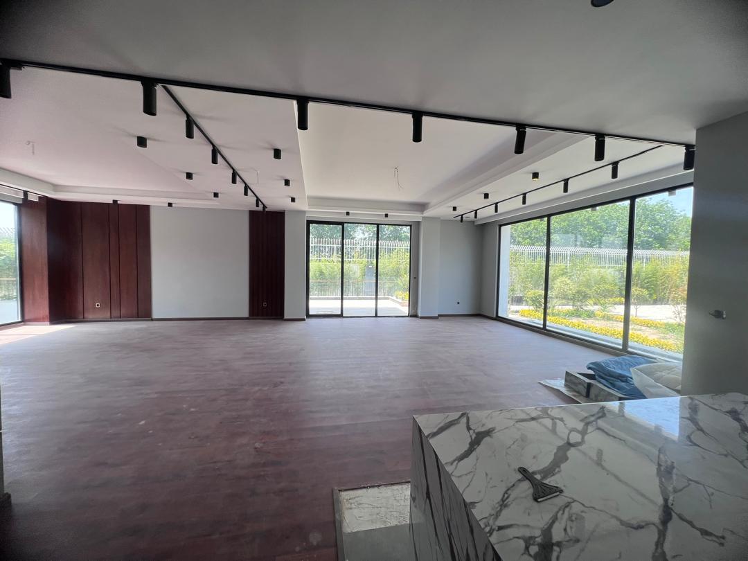 فضای داخلی: همانطور که در تصاویر پیداست، سالنهای پذیرایی بسیار دلباز با پنجرههای سرتاسری (Floor-to-Ceiling) غرق در نور طبیعی هستند. کفپوشهای طرح چوب گرمای خاصی به فضا بخشیده و سیستم نورپردازی خطی (Track Lighting) روی سقف، جلوهای کاملاً مدرن ایجاد کرده است.