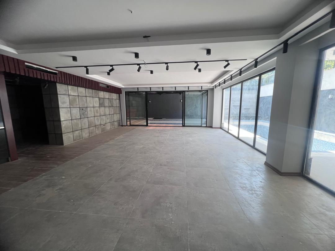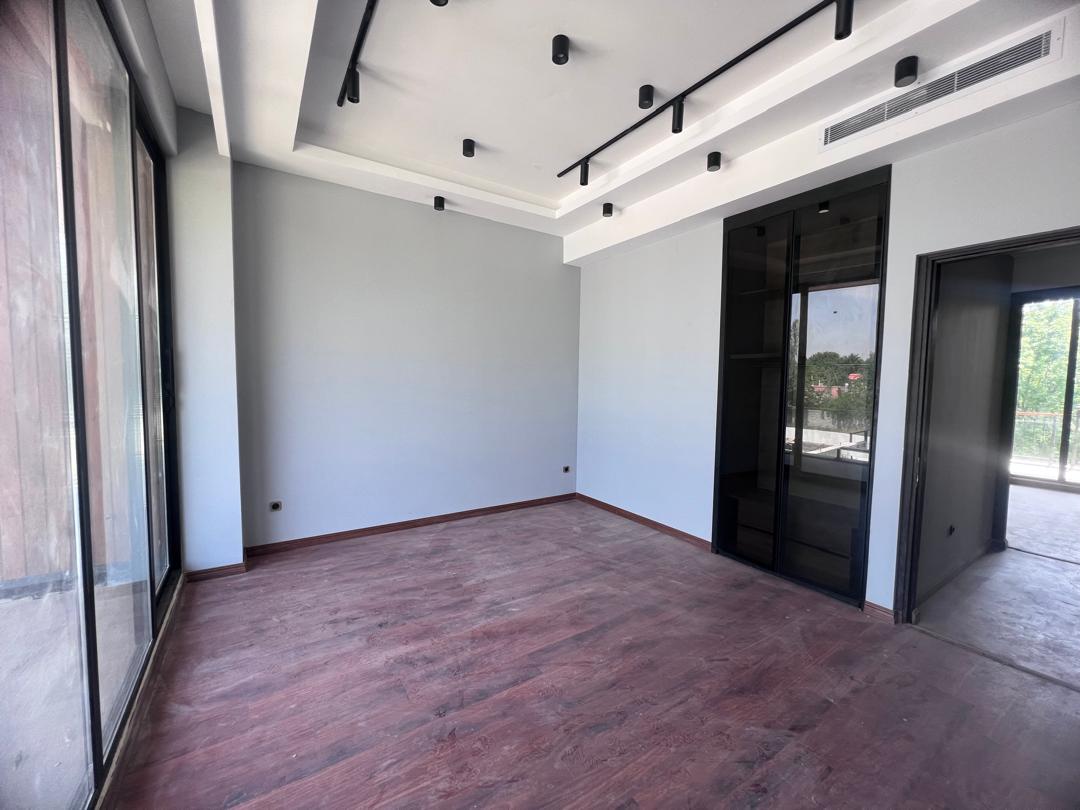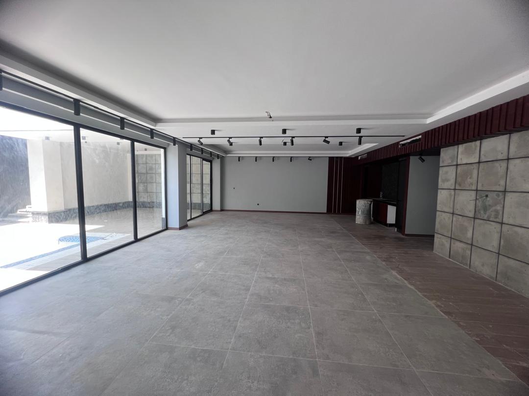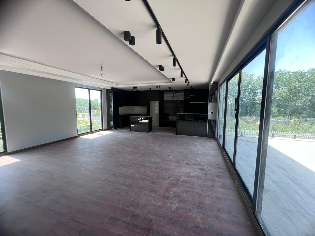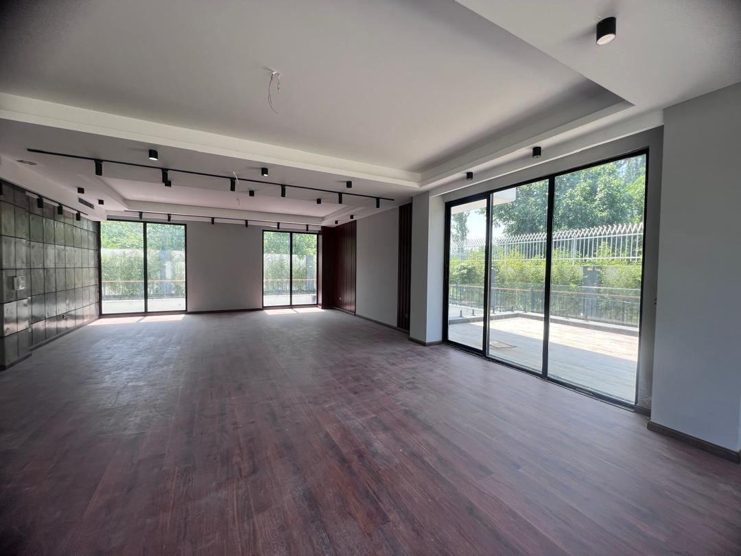 فضای داخلی: همانطور که در تصاویر پیداست، سالنهای پذیرایی بسیار دلباز با پنجرههای سرتاسری (Floor-to-Ceiling) غرق در نور طبیعی هستند. کفپوشهای طرح چوب گرمای خاصی به فضا بخشیده و سیستم نورپردازی خطی (Track Lighting) روی سقف، جلوهای کاملاً مدرن ایجاد کرده است.