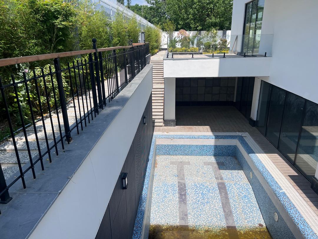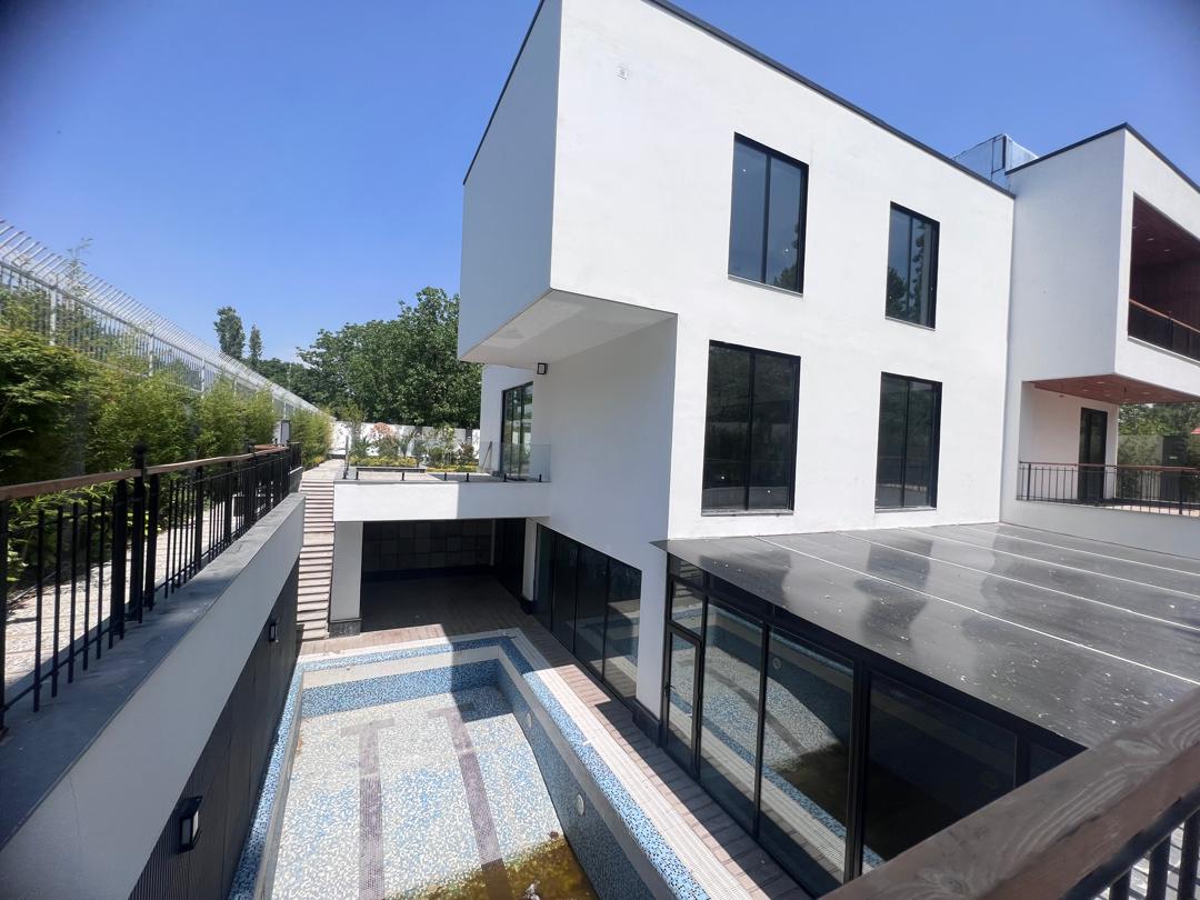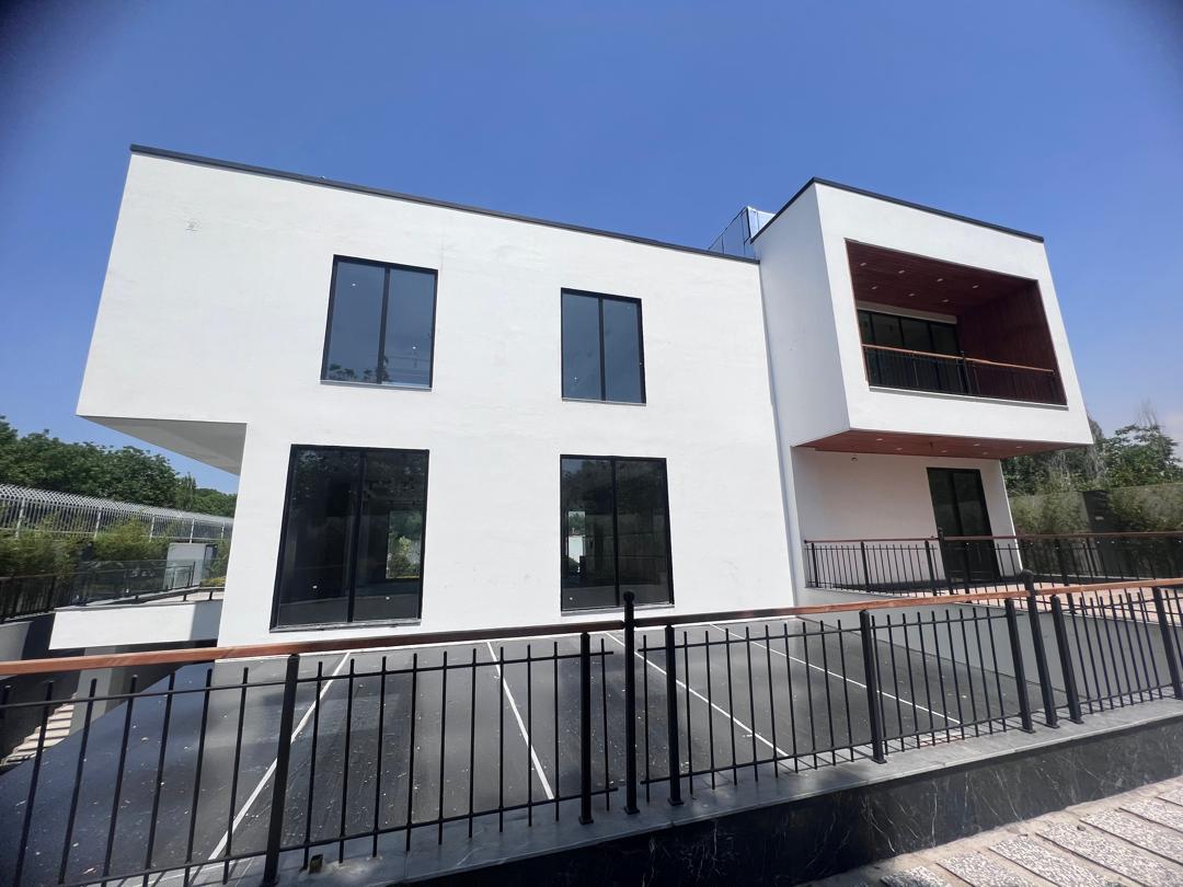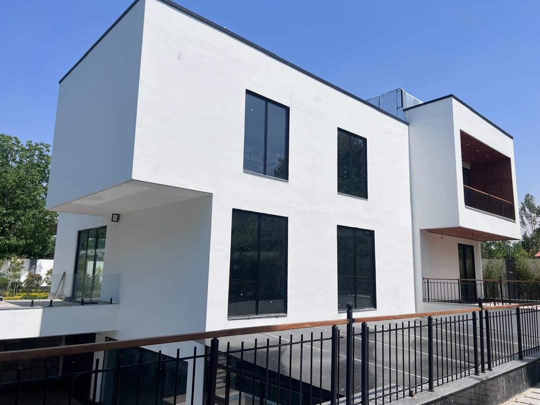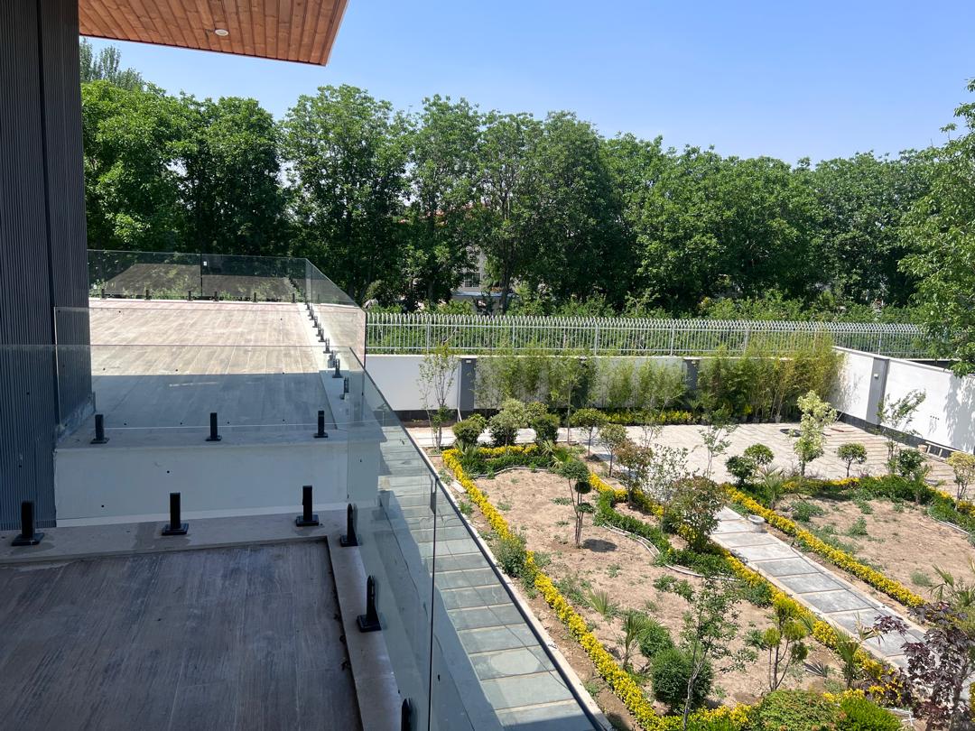 طراحی نما و ساختار: نمای ساختمان ترکیبی هوشمندانه از رنگ سفید مینیمال، متریال طرح چوب و شیشههای قدی بلند است که حسی از سبک و شکوه را منتقل میکند. تراسهای بزرگ با جانپناه شیشهای، دید پانوراما و بدون مانعی را به باغ سرسبز ملک میدهند.