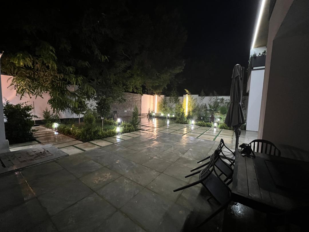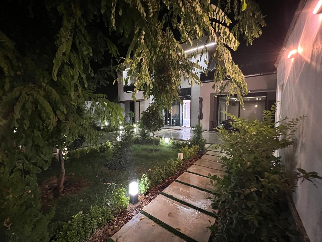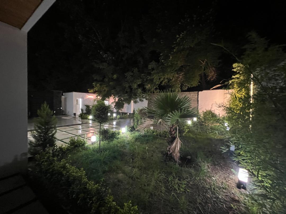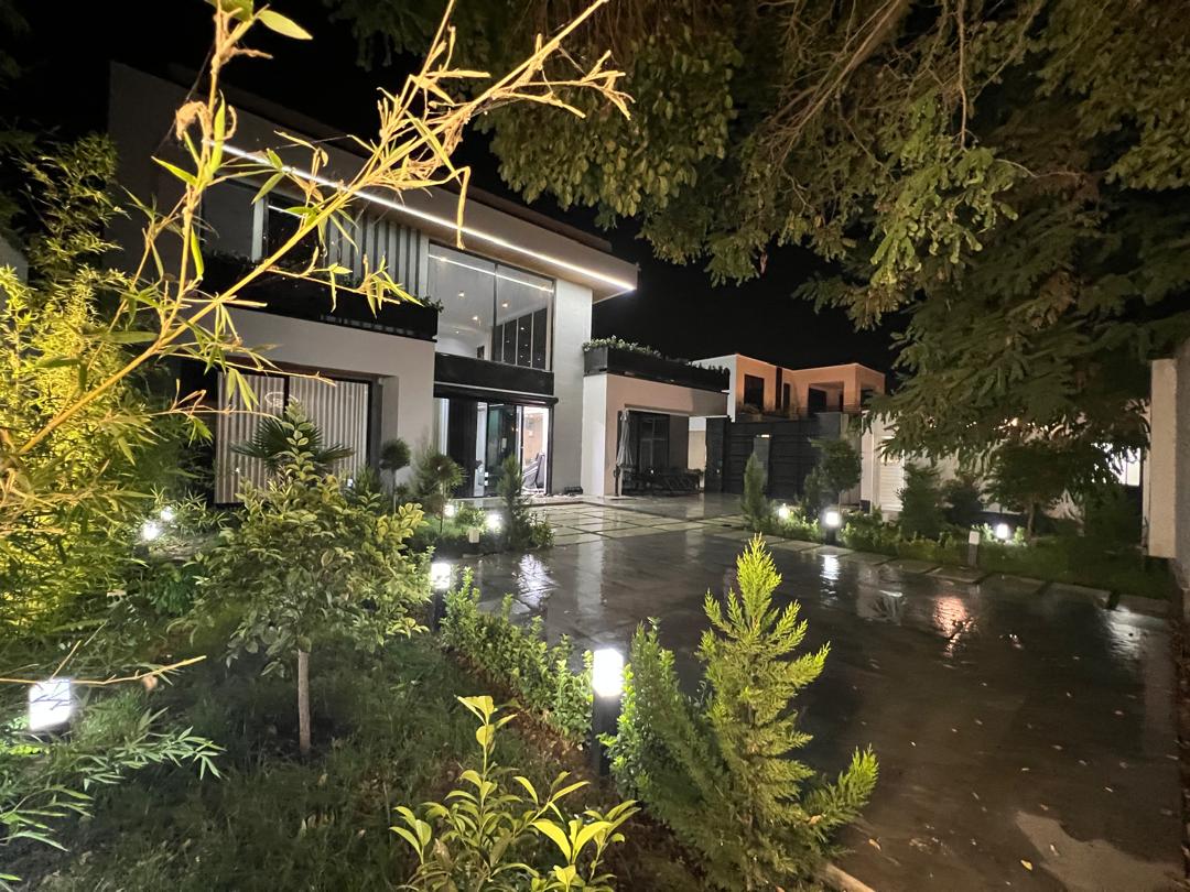 - محوطهسازی با گیاهان متنوع، درختان و راهروهای سنگفرش شده جلوهای ییلاقی و دلپذیر ایجاد کرده و نورپردازی بیرونی در شب، نمای ساختمان و باغ را گرم و دعوتکننده نشان میدهد.