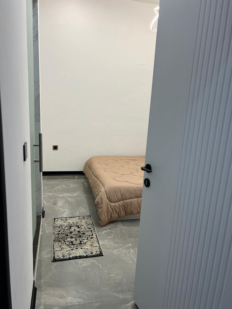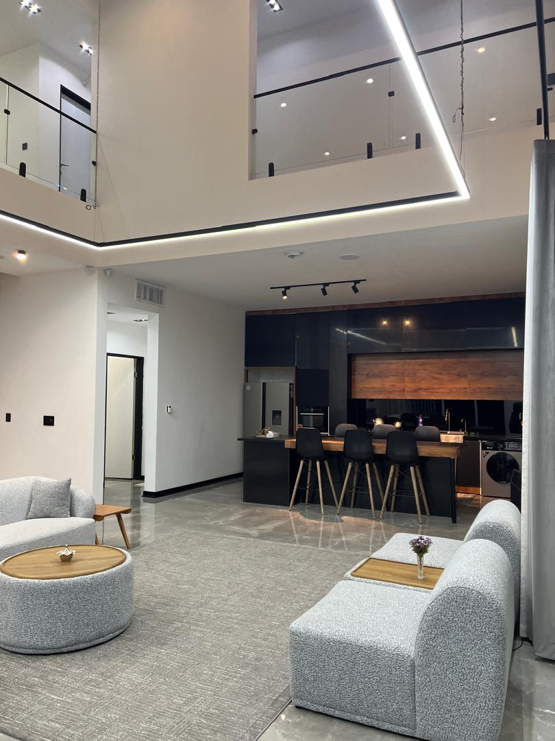 - پلان داخلی باز و مدرن است؛ سالن نشیمن با مبلمان منحنی و فرش خاکستری، حس راحتی و لوکس بودن را منتقل میکند.
