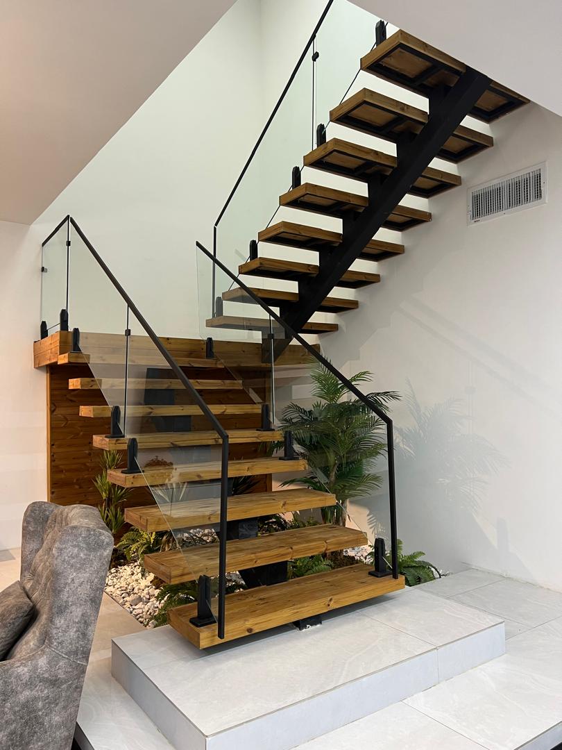 - راهپله داخلی با پلههای چوبی شناور و اسکلت فلزی مشکی، همراه با نرده شیشهای، حس مدرن و معلق بودن فضا را تقویت میکند.